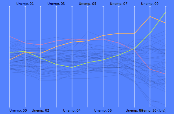 The comments on Kaiser’s post mainly picked on the variability of ranks, such that I set off to the US Bureau of Labor Statistics to get the (raw, though seasonal adjusted) yearly data. Here is what it looks like for the last 10 years with the US total rate highlighted: